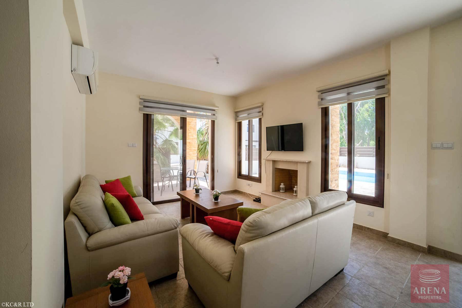 Inside find a large living area with spacious kitchen with granite counter tops and breakfast bar. A sitting area with two sofas surrounds the fireplace and large sliding glass doors lead to one of the covered verandas. An additional kitchen door also leads to a second downstairs covered veranda, perfect for use as a lounge or dining area. Also on the ground floor is a spacious bedroom with built-in storage, sliding doors leading outside to the veranda, and a bathroom with shower.