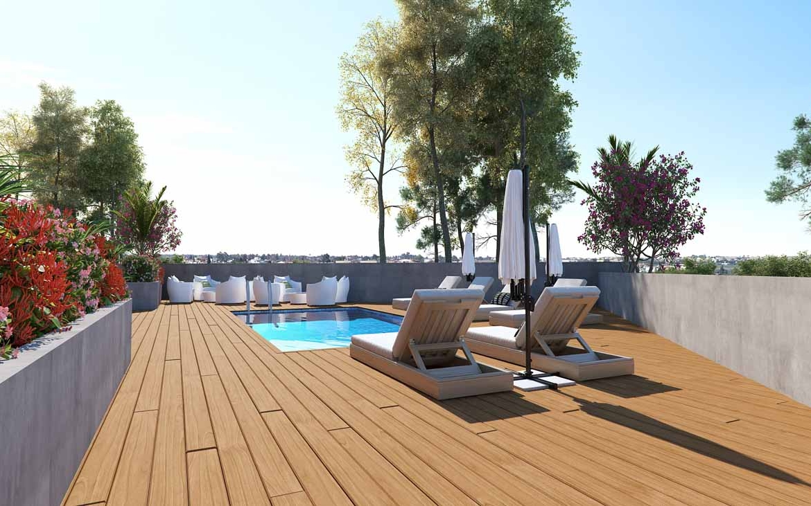 Entering the communal garden of the building, you are simply taken away by the beautiful landscape surrounding the communal pool, which will give the project a luxurious twist.
