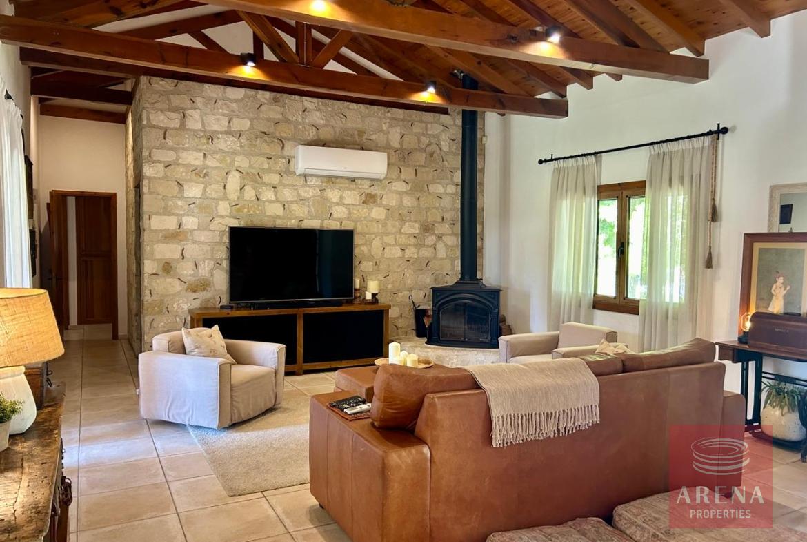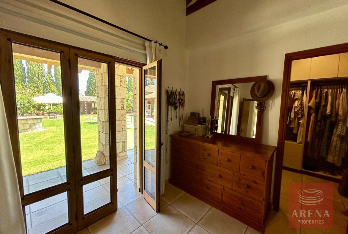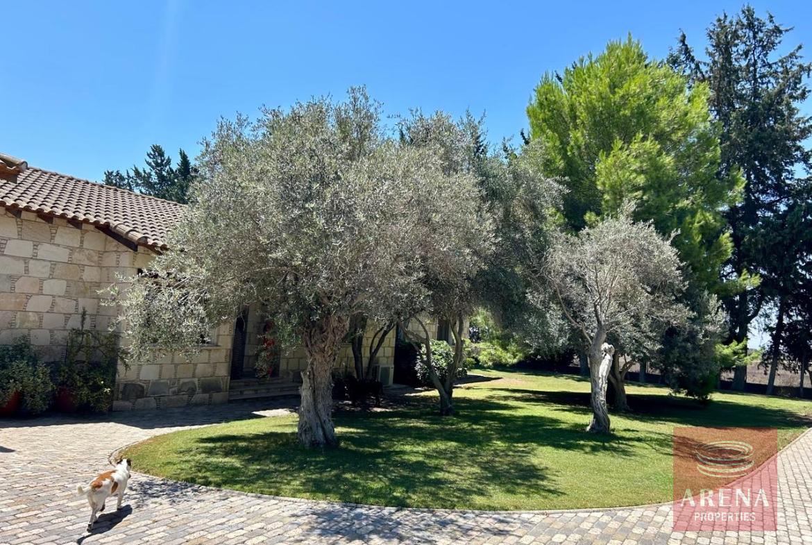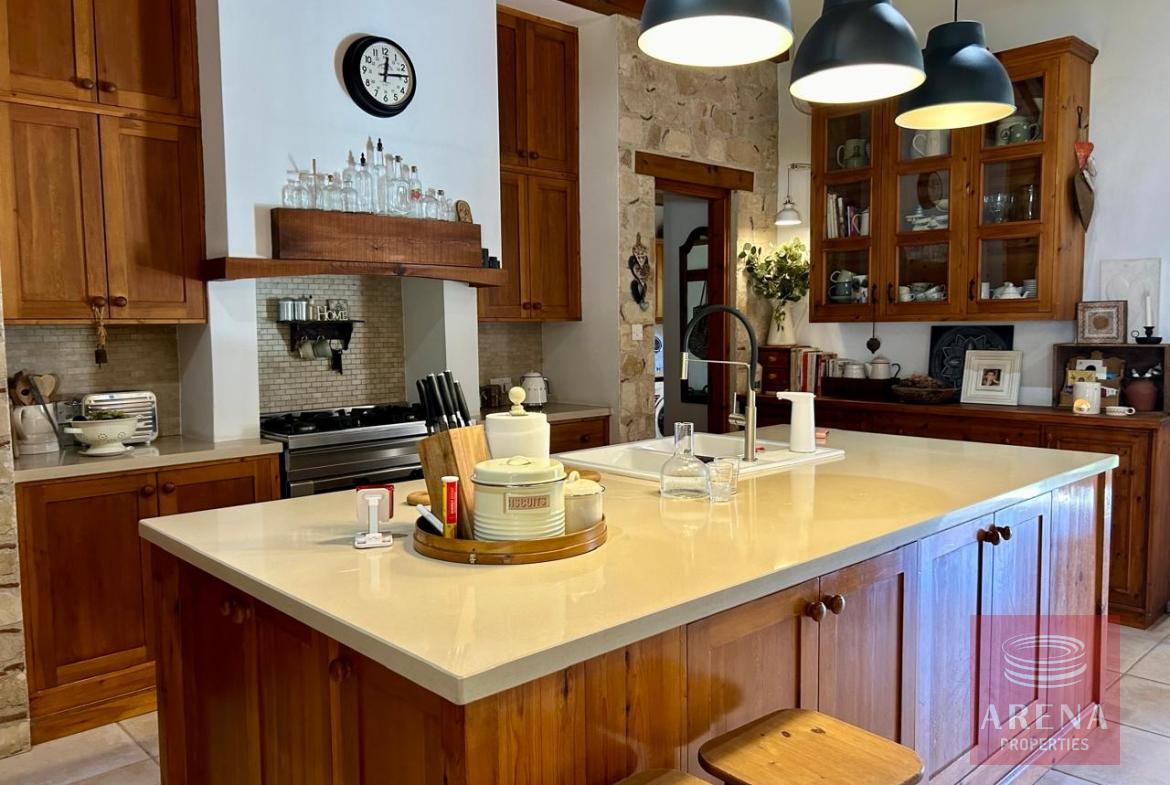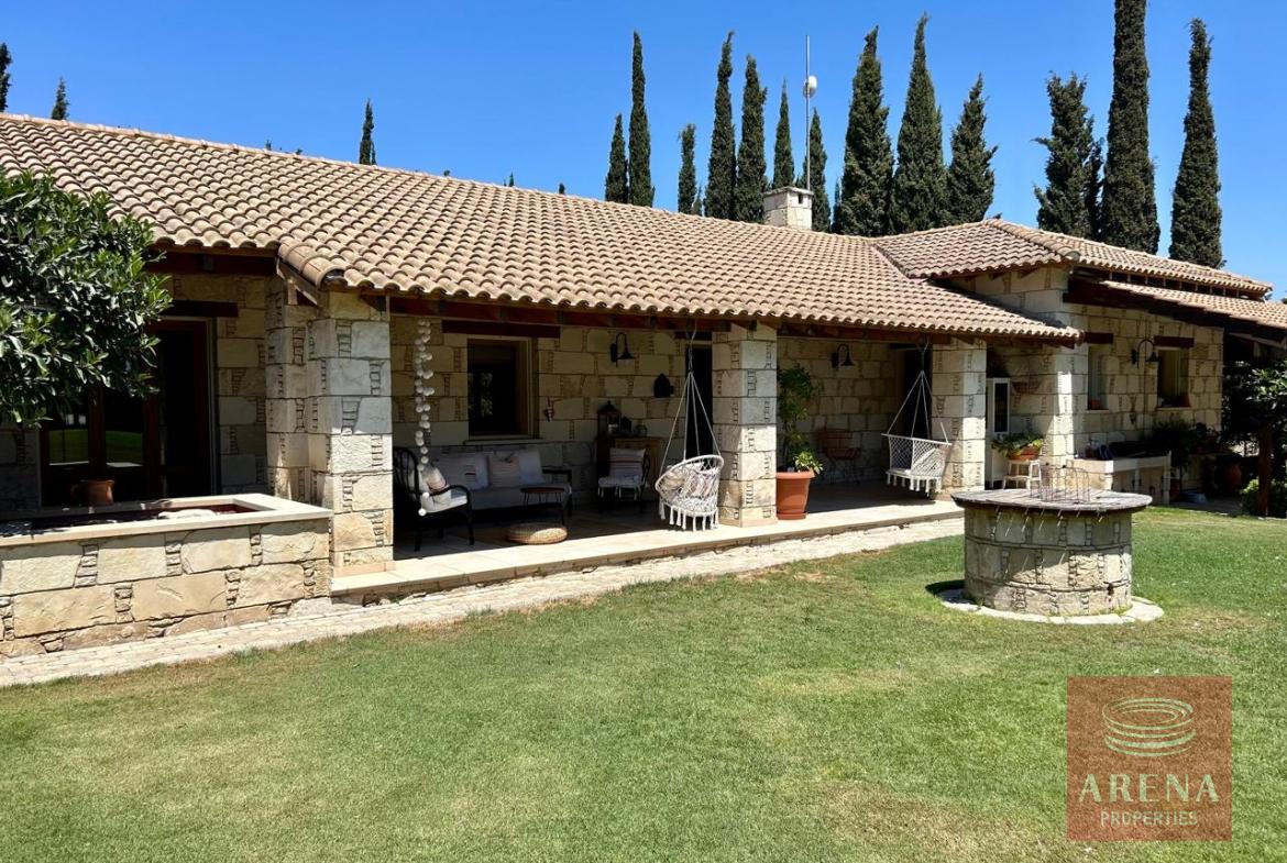 A unique 4-bedroom bungalow in a tranquil location on a plot of land of 13.780 m2! Stone, custom-built house! Four bedrooms 2 bathrooms Around 300 m2 covered area 13.780 m2 plot of land! Exclusively private location! Close to amenities: 2 km drive to Kiti with restaurants, shops, tavernas, coffee shops, 2 big supermarkets! 3 km to the beach! Underfloor heating and ACs! Insulated walls, thickness: 80 cm High ceiling – 4,5 m in the highest point Built in 2004! In a perfect condition, ready to move in! Covered garage for 2 cars! Covered parking! Spare kitchen and laundry area! 3 water wells! 1 guest house or gym! Fire place! Hand made real wood wardrobes and kitchen! Mosaic, authentic stone, beautiful driveway! Security cameras! Loft which can be used for storage! Furniture is negotiable! Master bedroom, living room are having access to the big covered veranda! Very cozy home, full of light! A luxury house one can dream of!