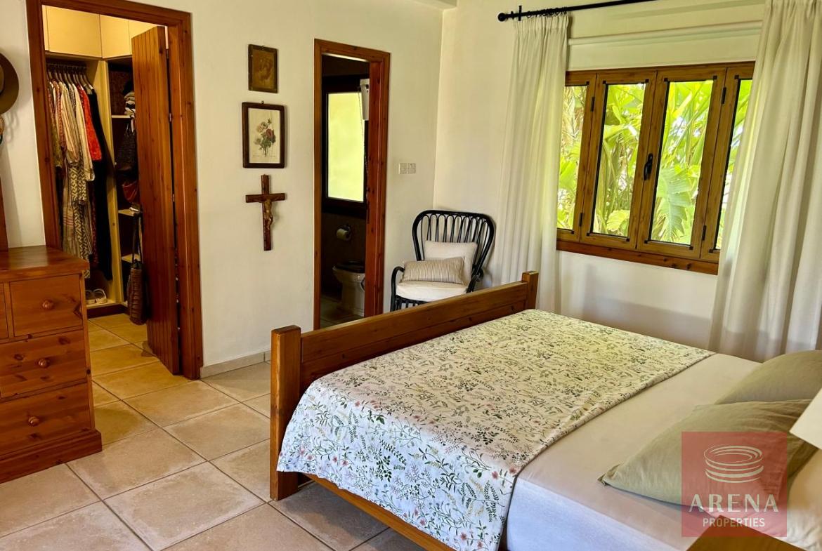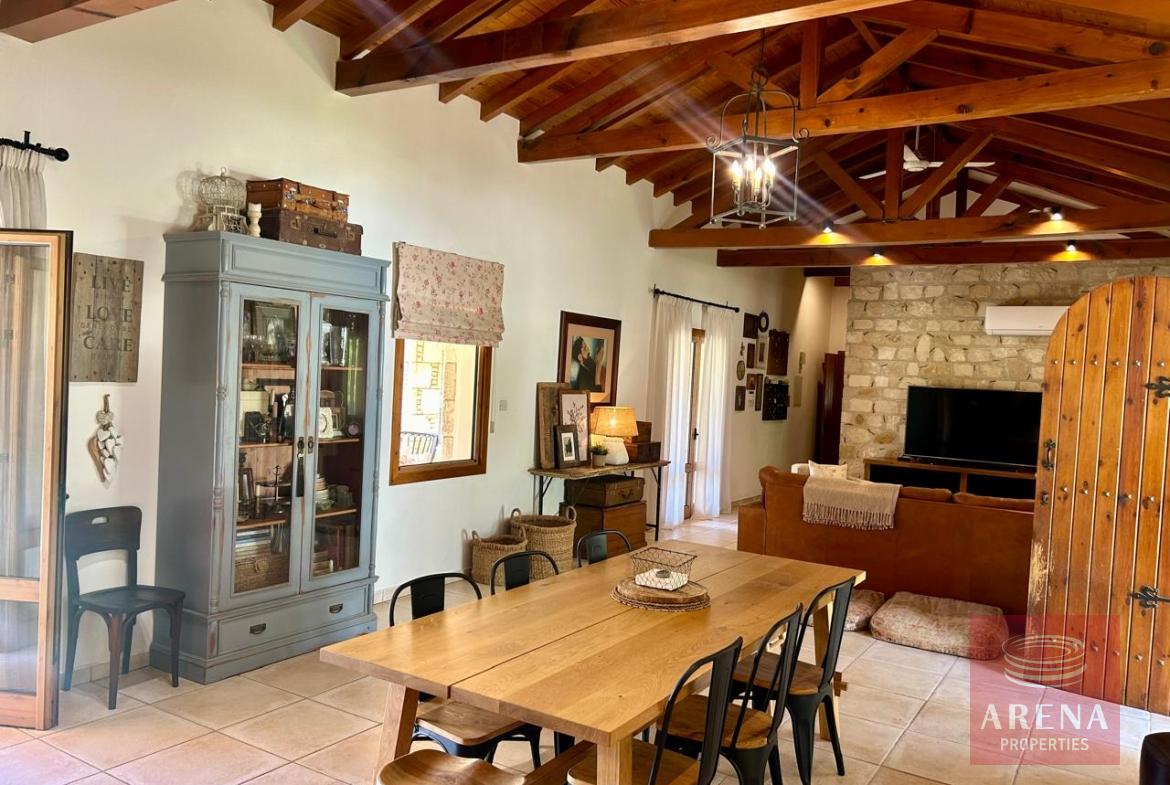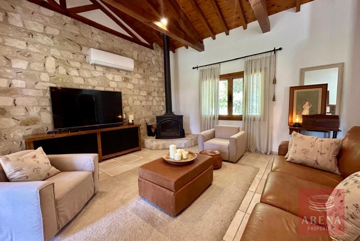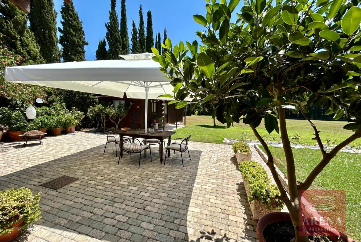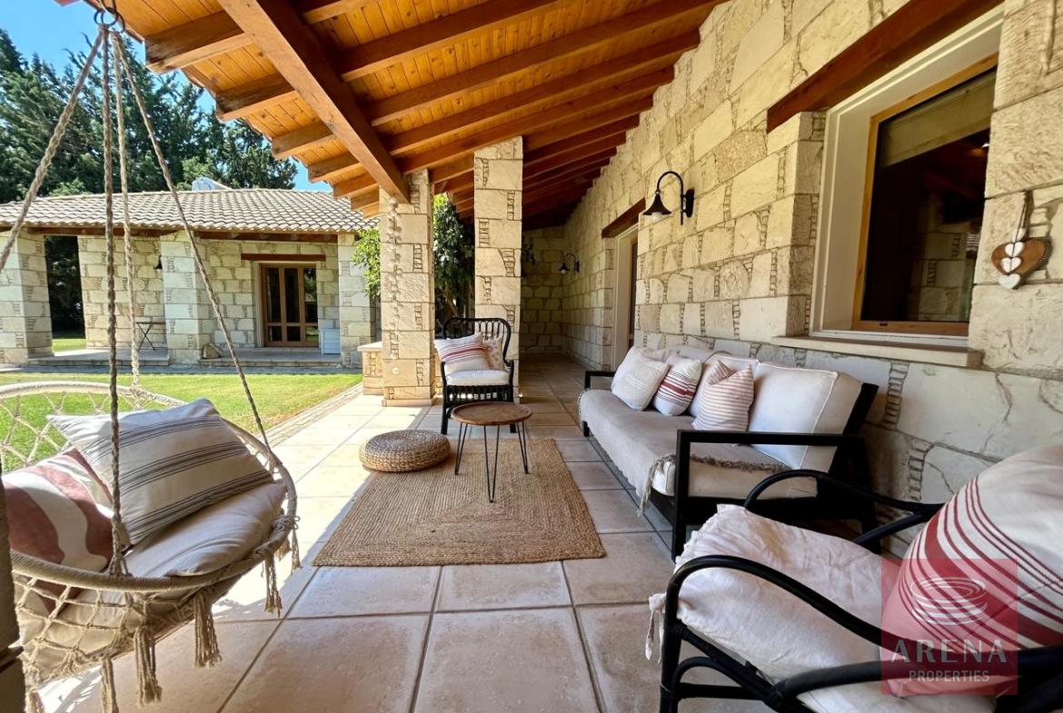A unique 4-bedroom bungalow in a tranquil location on a plot of land of 13.780 m2! Stone, custom-built house! Four bedrooms 2 bathrooms Around 300 m2 covered area 13.780 m2 plot of land! Exclusively private location! Close to amenities: 2 km drive to Kiti with restaurants, shops, tavernas, coffee shops, 2 big supermarkets! 3 km to the beach! Underfloor heating and ACs! Insulated walls, thickness: 80 cm High ceiling – 4,5 m in the highest point Built in 2004! In a perfect condition, ready to move in! Covered garage for 2 cars! Covered parking! Spare kitchen and laundry area! 3 water wells! 1 guest house or gym! Fire place! Hand made real wood wardrobes and kitchen! Mosaic, authentic stone, beautiful driveway! Security cameras! Loft which can be used for storage! Furniture is negotiable! Master bedroom, living room are having access to the big covered veranda! Very cozy home, full of light! A luxury house one can dream of!