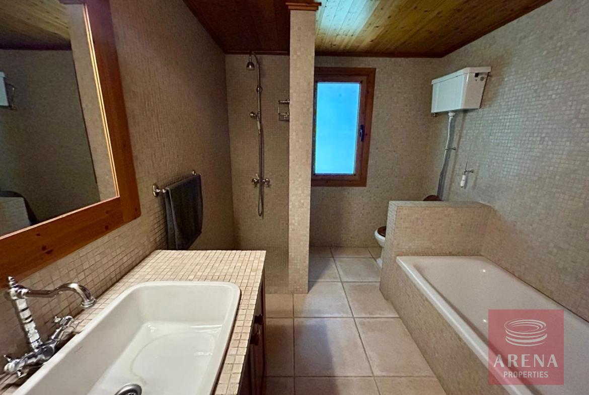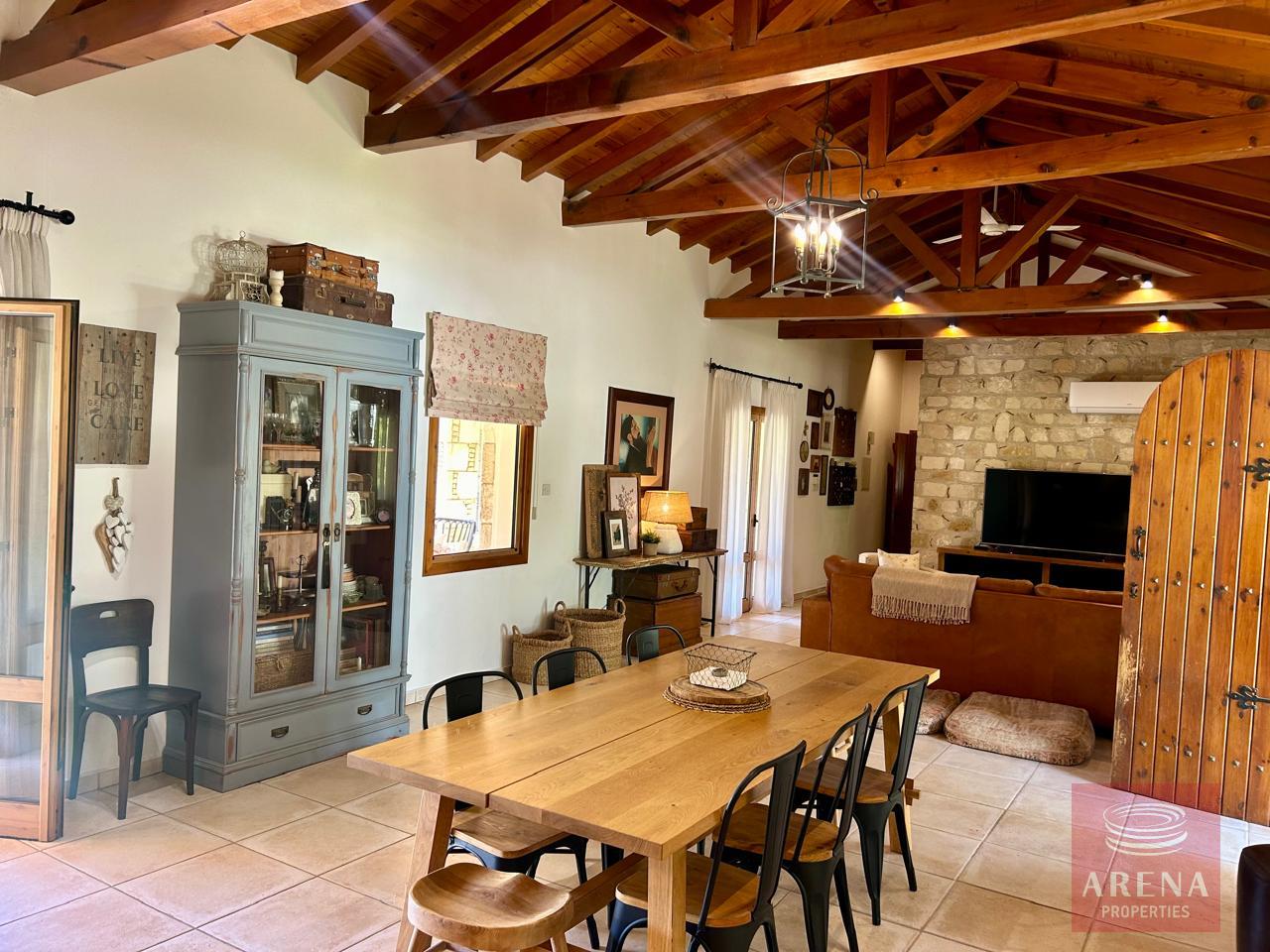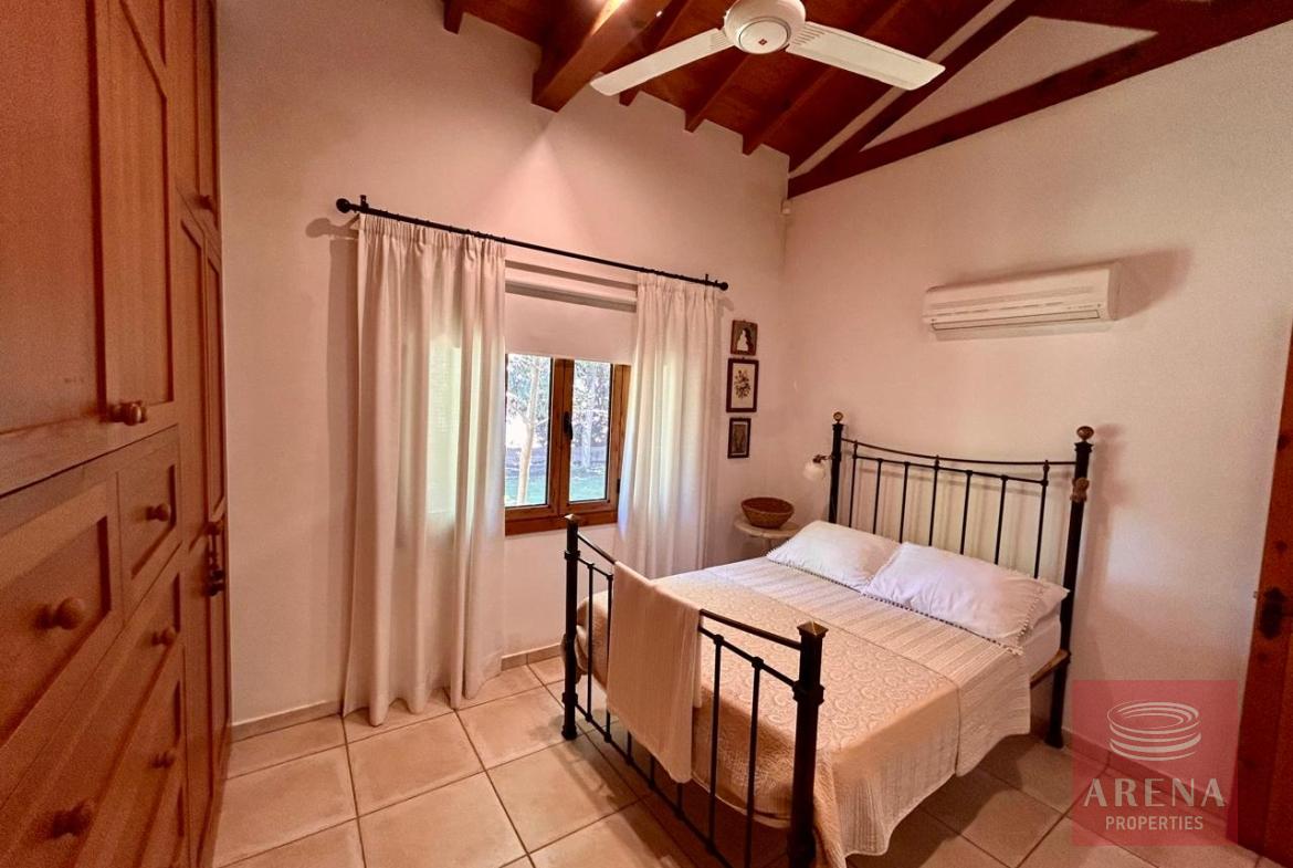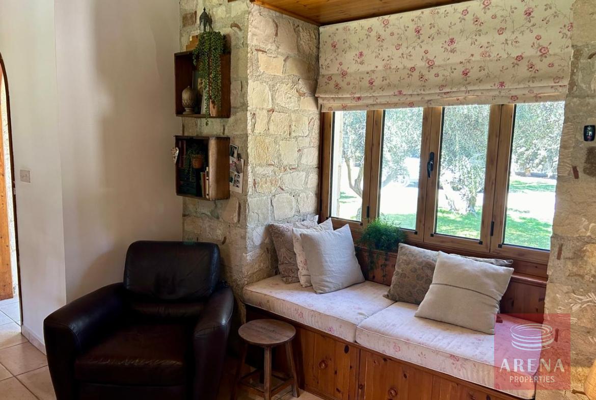 A unique 4-bedroom bungalow in a tranquil location on a plot of land of 13.780 m2! Stone, custom-built house! Four bedrooms 2 bathrooms Around 300 m2 covered area 13.780 m2 plot of land! Exclusively private location! Close to amenities: 2 km drive to Kiti with restaurants, shops, tavernas, coffee shops, 2 big supermarkets! 3 km to the beach! Underfloor heating and ACs! Insulated walls, thickness: 80 cm High ceiling – 4,5 m in the highest point Built in 2004! In a perfect condition, ready to move in! Covered garage for 2 cars! Covered parking! Spare kitchen and laundry area! 3 water wells! 1 guest house or gym! Fire place! Hand made real wood wardrobes and kitchen! Mosaic, authentic stone, beautiful driveway! Security cameras! Loft which can be used for storage! Furniture is negotiable! Master bedroom, living room are having access to the big covered veranda! Very cozy home, full of light! A luxury house one can dream of!