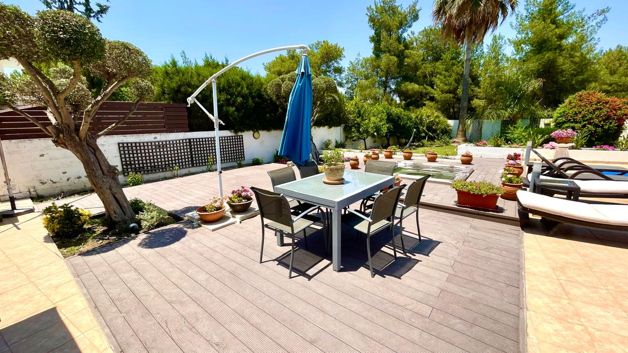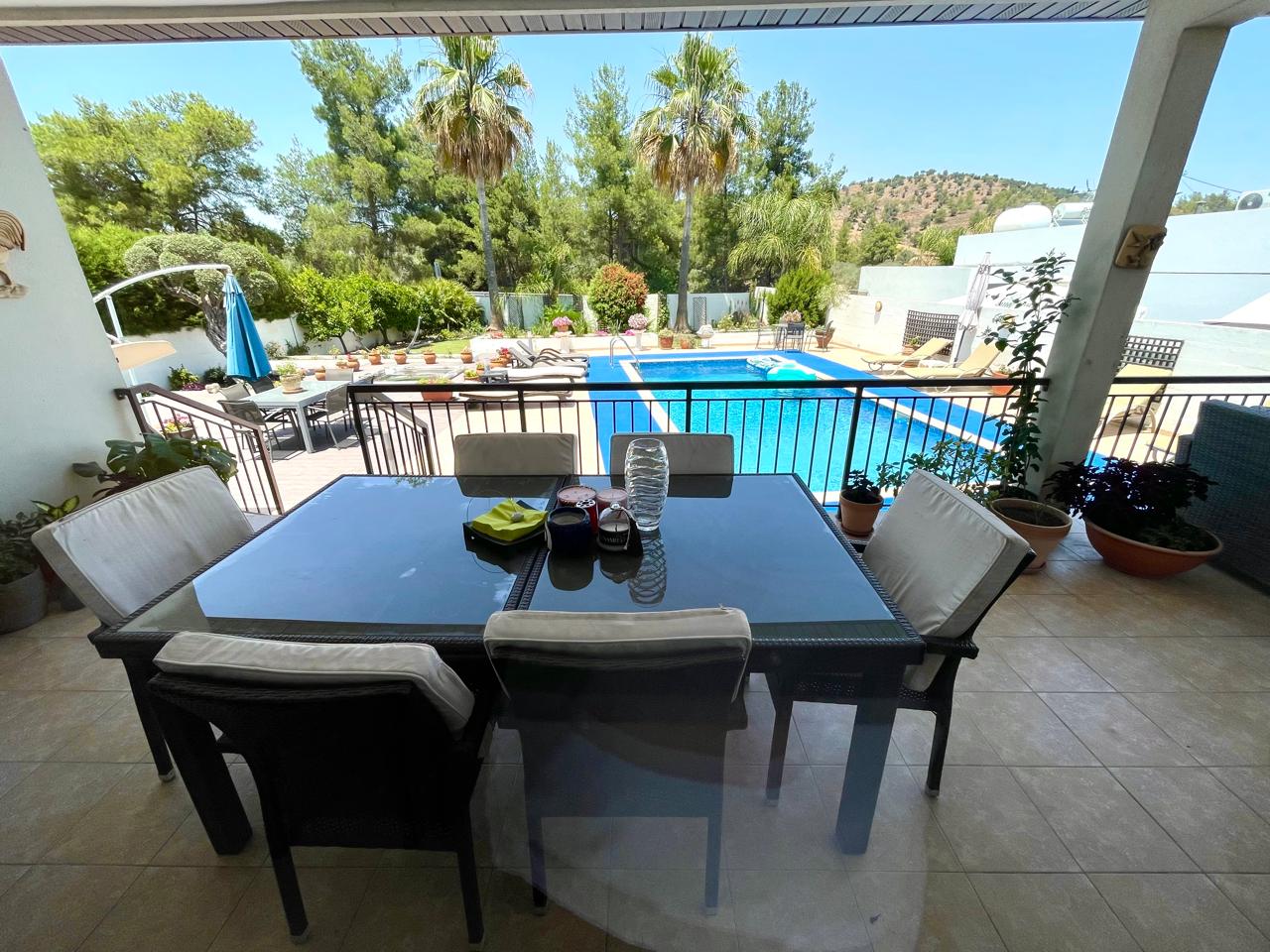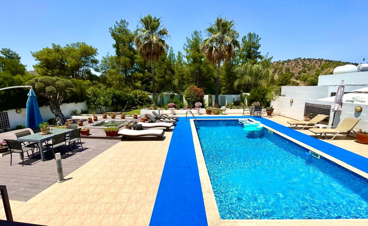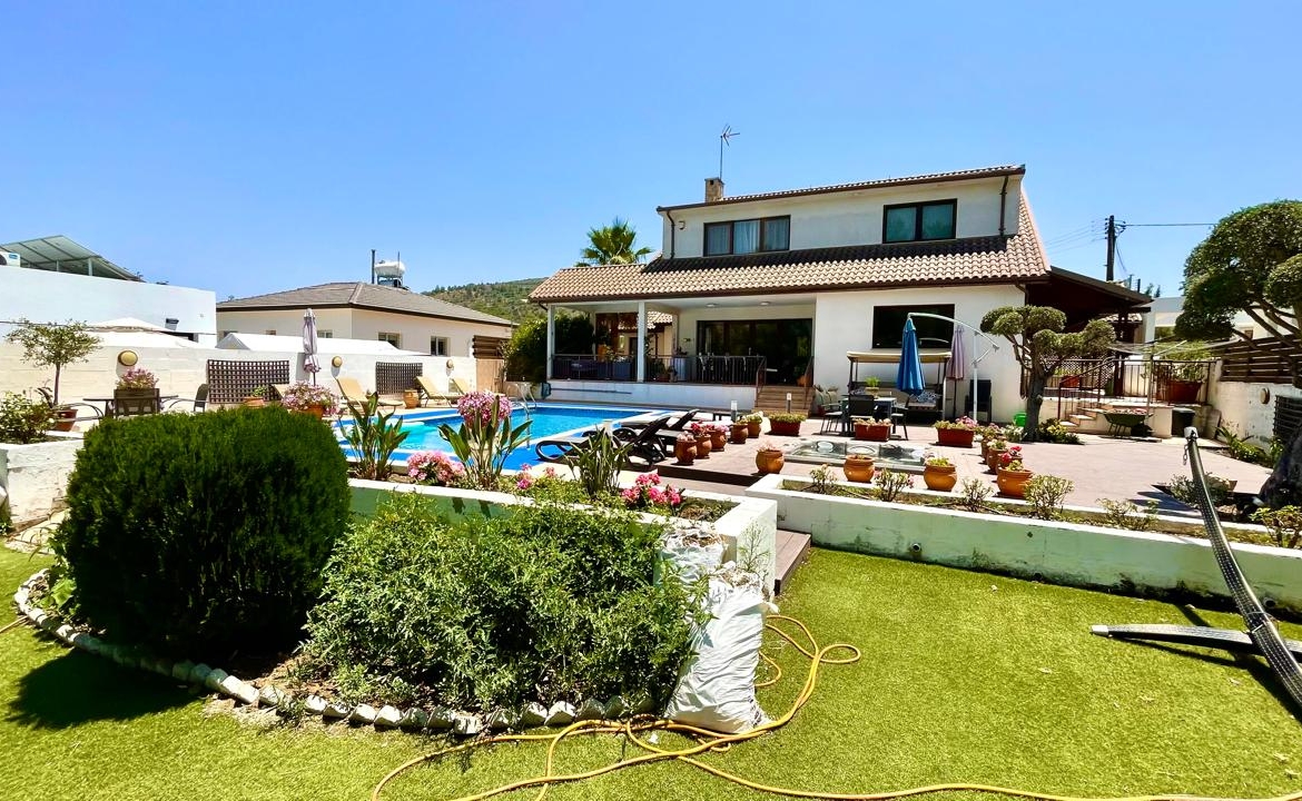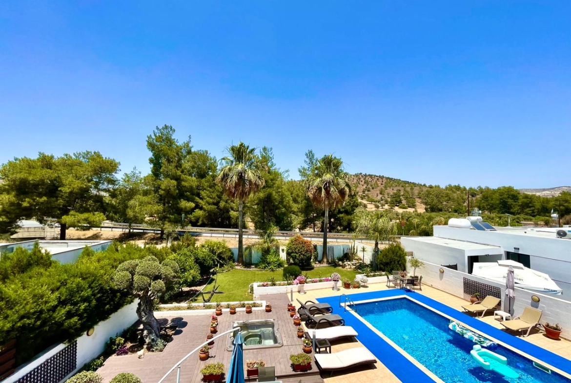 Situated in the beautiful village of Psevdas, proudly bring to the market this beautiful contemporary home. The house is built to very high specifications as is clearly visible throughout the home. The outside areas are ideal for entertaining and for enjoying a lovely lifestyle which residents of Cyprus enjoy throughout the year. With ample covered veranda areas, BBQ, decked areas with a built in hot tub, a very large pool and an outside shower and toilet area. The house also has an established garden, a double covered car port as well as a closed garage.