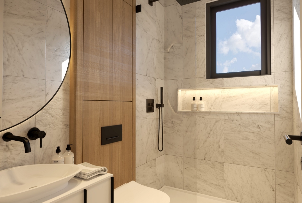 Nestled in a serene neighborhood, this two-story building redefines modern apartment living. With only six thoughtfully designed apartments, the building blends minimalist architecture with warm natural elements, a balance of clean white facades and sophisticated wood-textured accents. Expansive balconies and carefully curated greenery create a seamless connection between indoor comfort and outdoor tranquility.