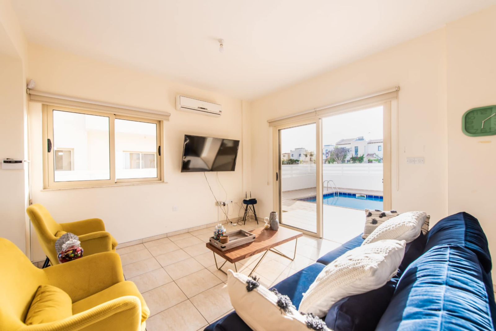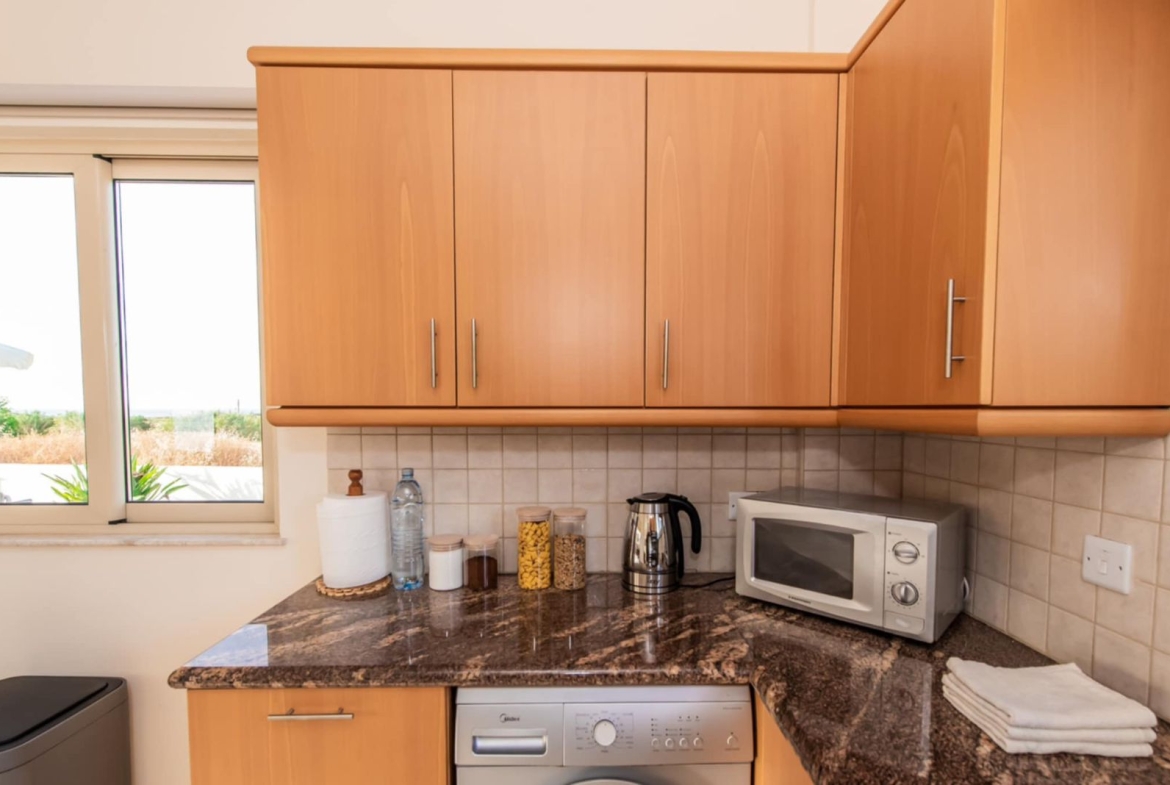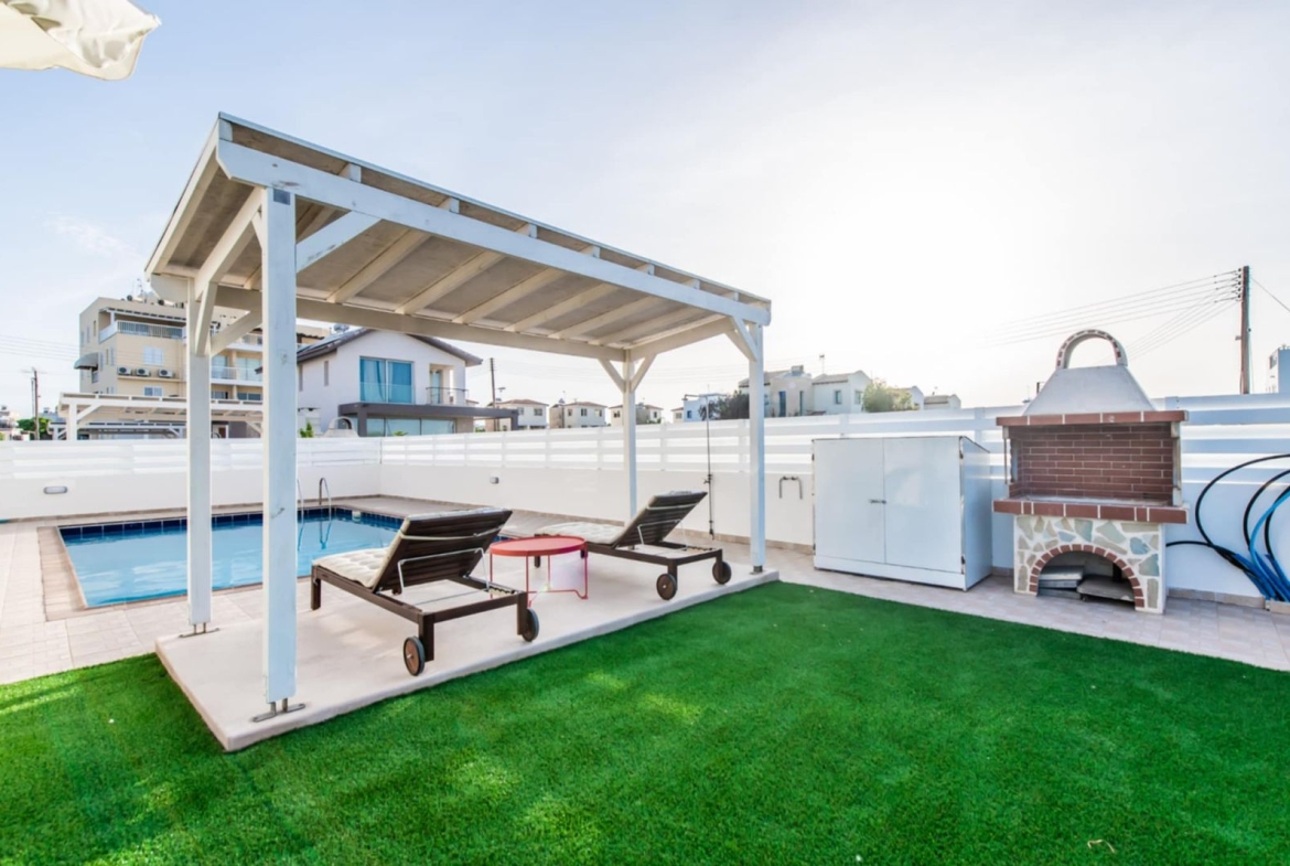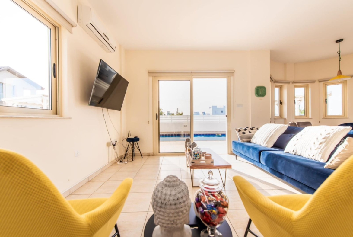 The villa features a beautiful private swimming pool surrounded by a well-maintained outdoor area, creating the ideal setting for relaxation and entertaining. Sea views can be enjoyed from the property, and the beach is just a 10-minute walk or a 2-minute drive away. Local restaurants, cafés, and bars are close by, while Larnaca Airport is conveniently located 63km away—approximately a 50-minute drive.