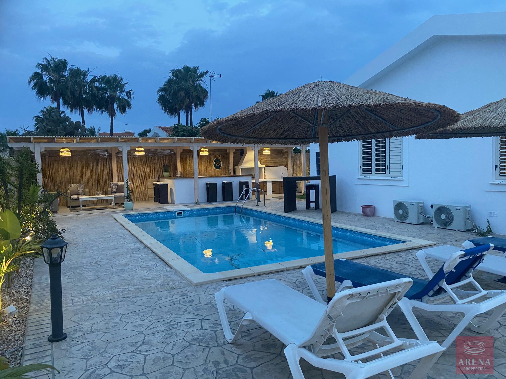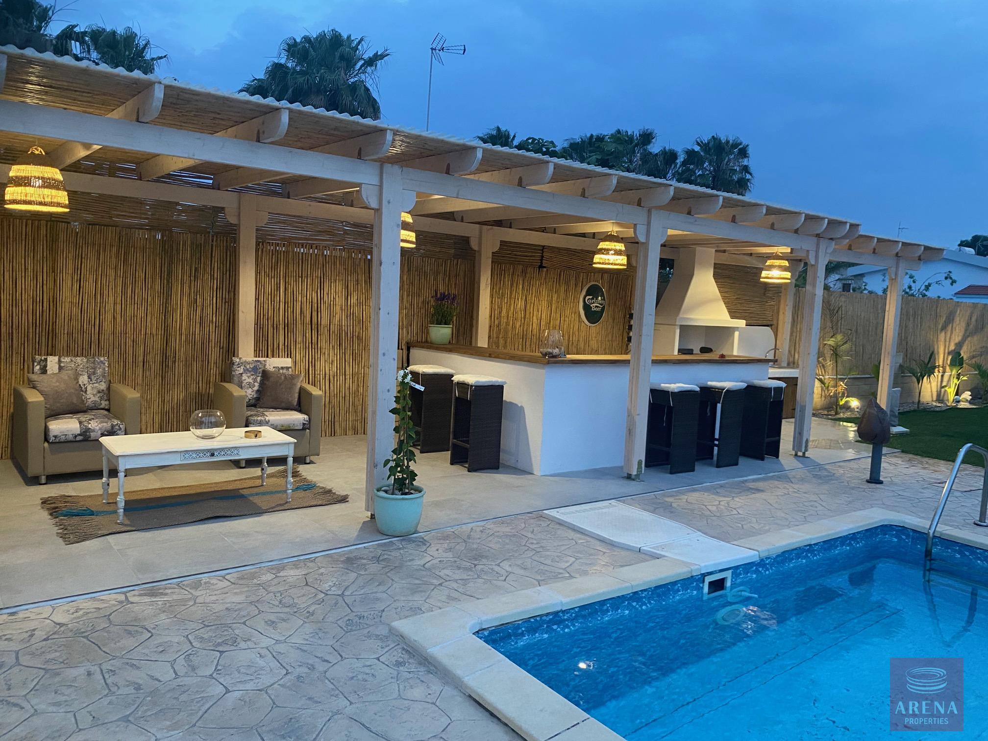 Three bedroom bungalow for rent in Pervolia-Meneou beach side, Larnaca. Located only 70m from the beach, in a short drive to all amenities, easy access to the high way, and only 5km from the Airport, and 12km from Larnaca city center. The house consists of an open plan living/dining room and kitchen, three bedrooms, family bathroom, W/C with a shower, covered veranda, and large garden with pool and pool bar/BBQ.