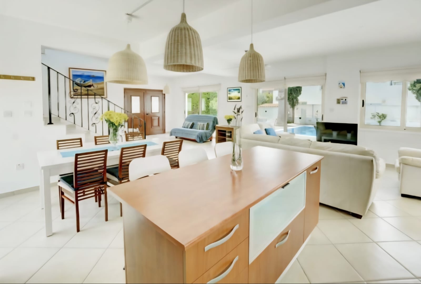 Step inside to find a spacious and beautifully furnished living area spanning 160m². The open-plan design is both modern and inviting, seamlessly connecting the living, dining, and kitchen areas. The villa is equipped with air-conditioning throughout, ensuring your comfort all year round.