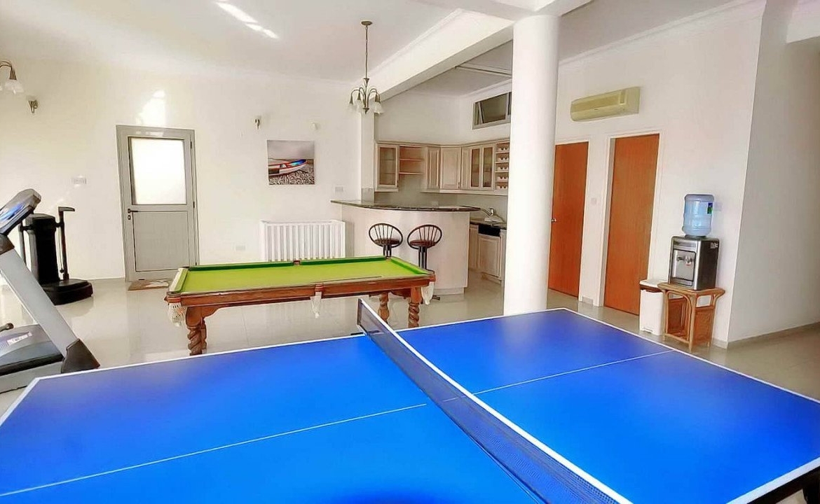 From the main entrance floor a flight of stairs leads down to a games room with a bar /kitchenette, utility room and self-contained maid’s quarter. From here one also has direct to the swimming pool area through large sliding patio doors