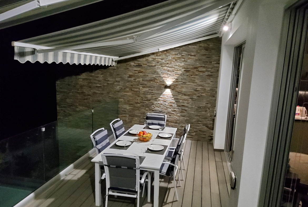 This modernised villa, with plenty of natural light throughout, boasts an open-plan, fully equipped kitchen and a living/dining area that leads directly onto the outside sea-view terrace, ideal for alfresco dining overlooking the sea. One full bedroom ensuite completes the first floor. Downstairs, you will find two spacious en-suite bedrooms, both open to the garden and pool area. The villa benefits from its roof terrace, offering breathtaking sea views.
